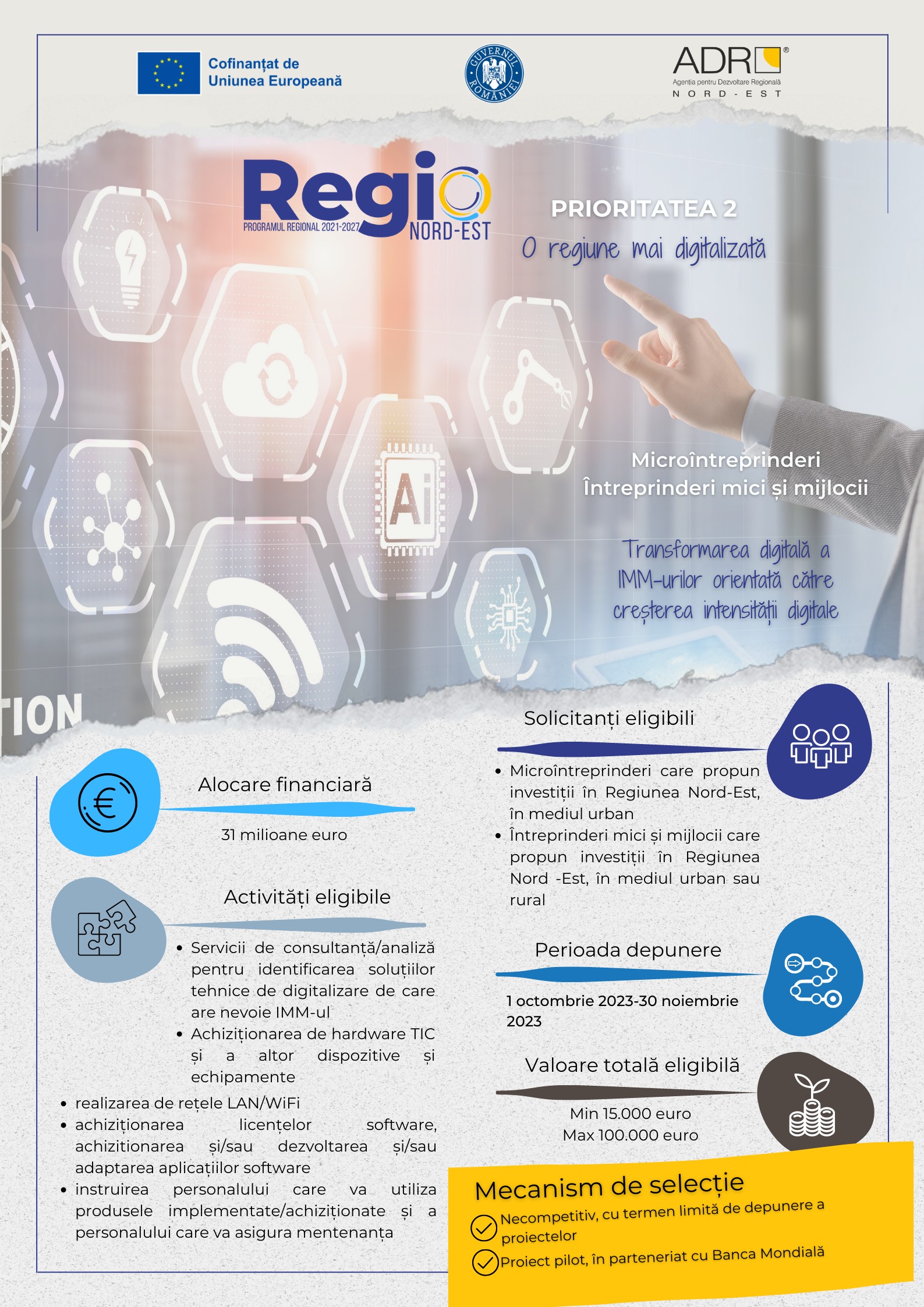 aug.222023 Primul apel de proiecte lansat în cadrul Programului Regional Nord-Est: Transformarea digitală a IMM-urilor Noutăți Citește tot