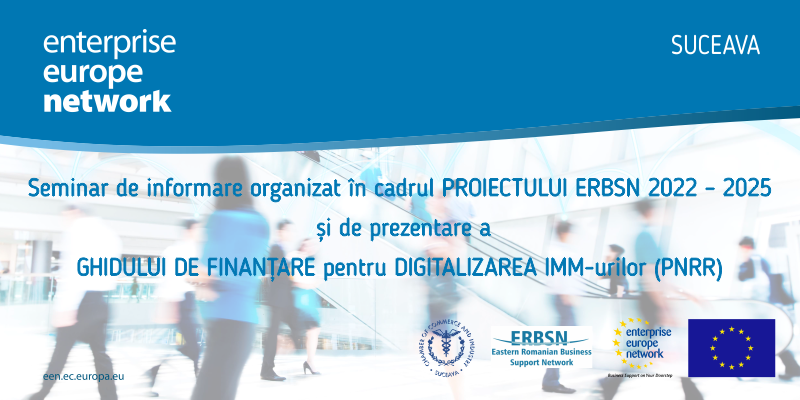 Camera de Comerț și Industrie Suceava, în calitatea de partener în cadrul proiectului Eastern Romanian Business Support Network (Rețeaua pentru sprijinirea afacerilor din estul României) – ERBSN 2022 – 2025, parte a rețelei Enterprise Europe Network, cea mai mare rețea de sprijin din lume pentru IMM-urile care își doresc să inoveze și să își dezvolte activitatea pe alte piețe, are onoarea de a vă invita să participați la